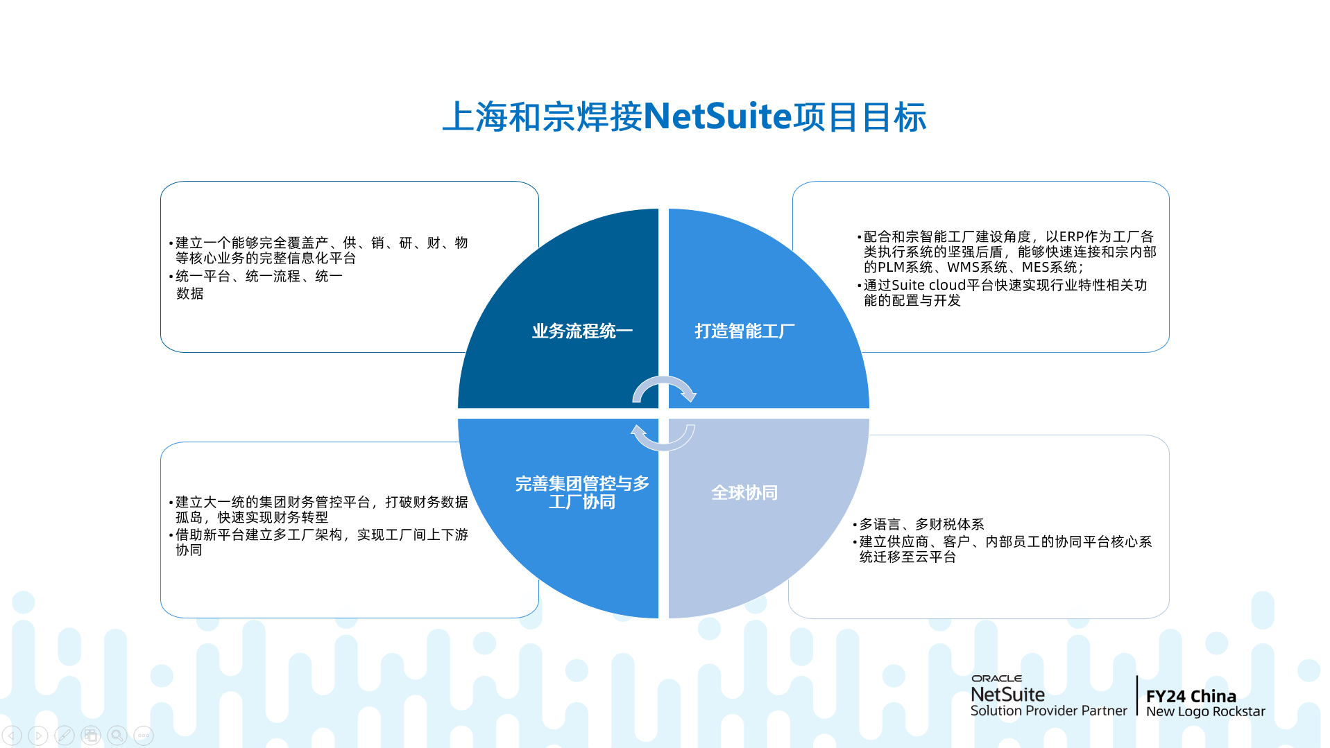 类似的成功客户还有工贸一体行业的和宗焊接设备制造有限公司(以下简称和宗焊接),一方面和宗焊接存在销售人员和大客户订单在海外的国际化需求,另一方面还需要一个系统链接自研的、带有很强行业属性的子系统,Oracle NetSuite的出现完美契合了和宗焊接的需求。Hitpoint Cloud以Oracle NetSuite为核心创建了贯彻销售管理、生产管理、供应链管理、财务管理的信息系统支撑体系,助力和宗焊接铸造焊接般坚固品质。